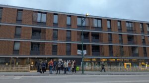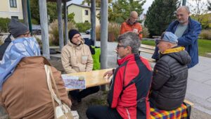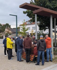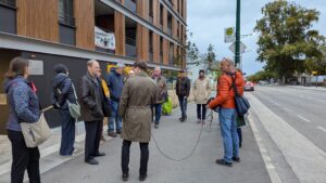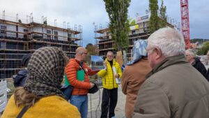 Interessierte Neusiedlerviertler:innen machten sich gemeinsam auf den Weg durchs gut bekannte Viertel um Neues und Wissenswertes über die neu errichteten Gebäude zu erfahren. Am Fliegenspitz informierte Vizebürgermeister Rainer Praschak über die zentralen Meilensteine der Stadtteilentwicklung im Neusiedlerviertel. Im Anschluss schilderte Martin Nikisch (ARE Development) die Herausforderungen, die mit der Umsetzung der Bauprojekte verbunden sind. An der Baustelle des mehrgeschossigen Wohnbaus (Zone V) erzählte Architektin Christine Janiczek von MBM Architekten wie sich dieses Projekt entwickelt hat. Vor den Stadtvillen (Zone IV) berichteten die Architekten Günter Klein und Jakobus Schwarz von MAGK Architekten über dieses besondere Bauprojekt, dass in Holzbauweise errichtet wird. Der Abschluss der Führung fand beim Nahversorger (Zone I) gegenüber der HTL statt. Hier wird Anfang 2026 im Erdgeschoss ein griechischen Imbiss eröffnet.